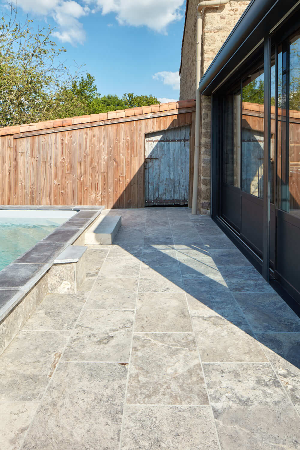 Le Travertin Silver est une pierre naturelle non gélive, offrant des teintes contemporaines allant du gris clair au gris foncé avec des touches de beige. Pour les clients, il offre un entretien facile, agrandit les espaces de vie extérieurs, et se démarque par sa couleur distinctive par rapport aux autres travertins.